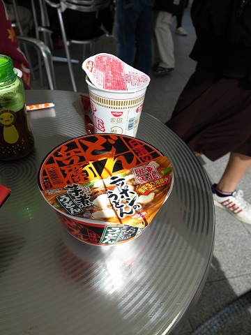カップ麺を持った人が、ぞくぞくと歩いているので