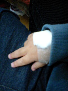 点滴が抜けないようにテープで巻かれた弟ギャング。
