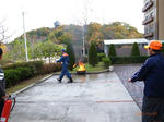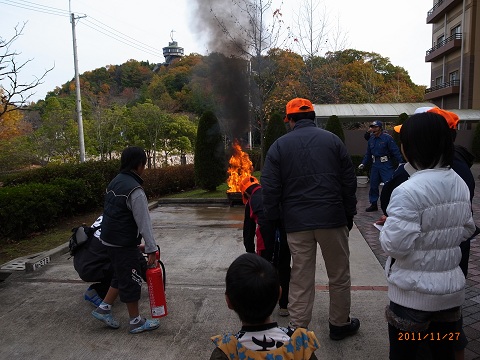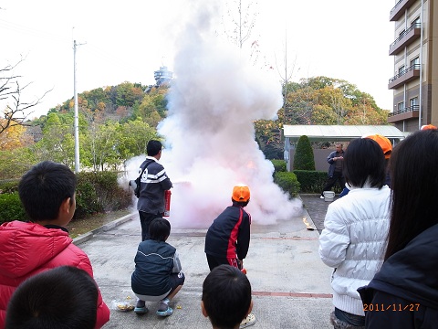火に向かって消火剤をかけるのではなく、火元にかけてくださいとのこと。