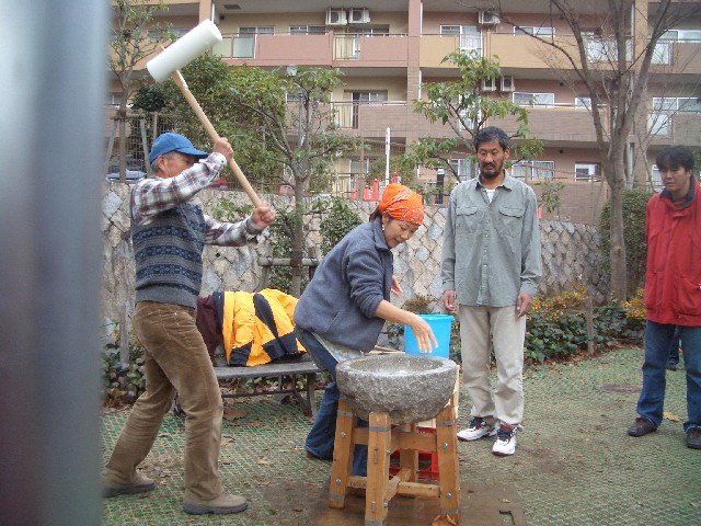 冷たい風が吹く中、マンション内で餅つきがありました。