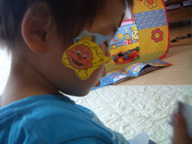 顔にペタペタ貼って、ご機嫌です。